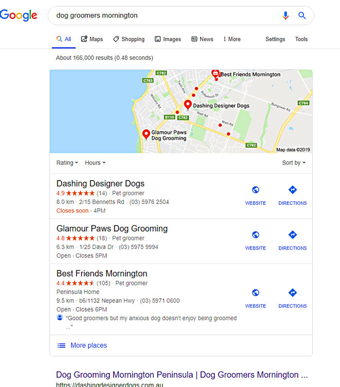 Dashing Designer Dogs ranks at the top of page 1 for Dog Groomers Mornington.